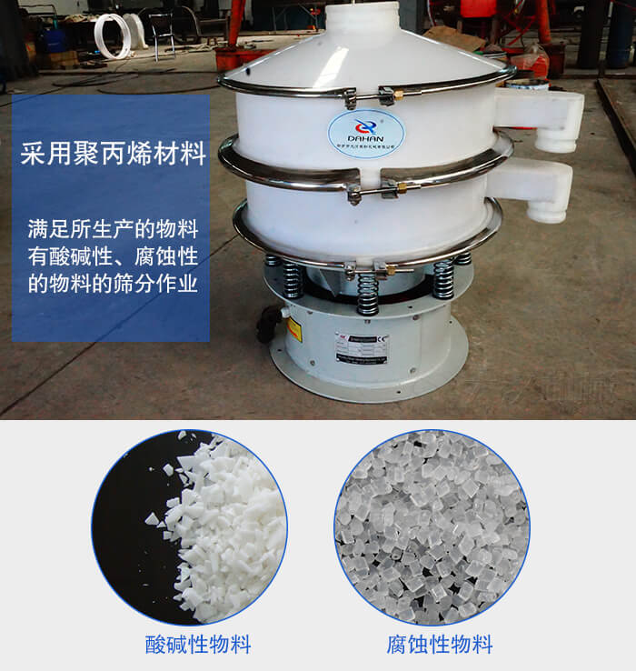 塑料振動篩也叫做聚丙烯振動篩,塑料防腐蝕振動篩,塑料旋振篩采用聚丙烯材料也叫PP材料通過特殊的加工工藝制作的用于滿足所生產的物料有酸堿性、腐蝕性的物料的篩分作業。塑料振動篩從篩框、篩網到清網裝置完全采用非金屬材料,徹底排除了一些特殊物料與金屬接觸會產生化學反應的問題。