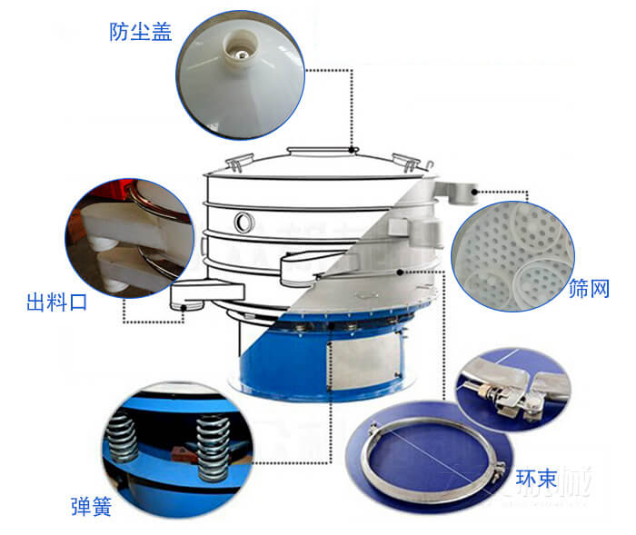塑料振動篩主要由進料口、防塵蓋、出料口、束環、篩網、配重塊、上部重錘、振動體、振動電機、彈簧、下部重錘、機座等部分組成。