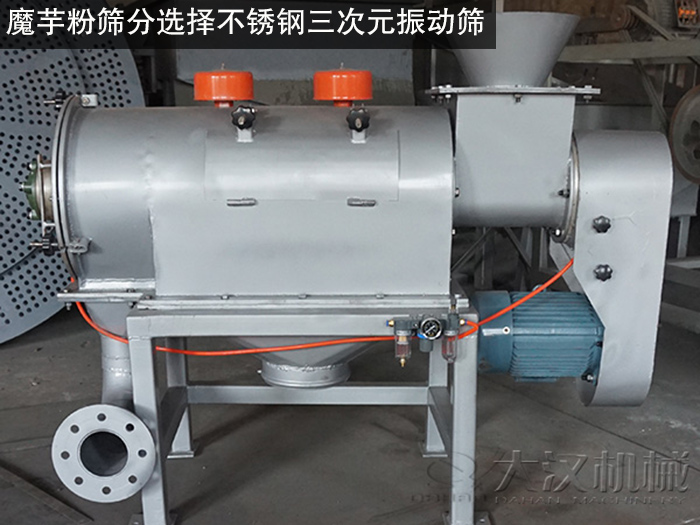 大漢機械的技術人員根據(jù)魔芋粉的特性選擇使用不銹鋼三次元振動篩,進行對其篩分作業(yè)。