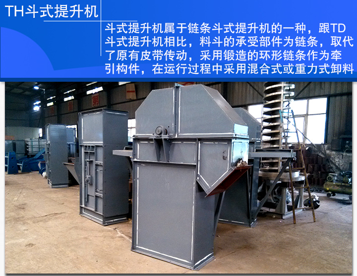 TH斗式提升機屬于鏈條斗式提升機的一種,跟TD斗式提升機相比,料斗的承受部件為鏈條,取代了原有皮帶傳動,采用鍛造的環形鏈條作為牽引構件,在運行過程中采用混合式或重力式卸料。