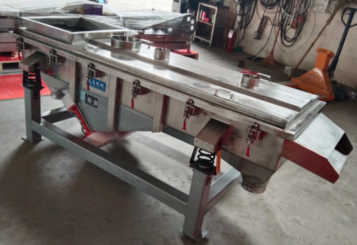 它的運動軌跡是直線或者差不多直線的樣子,靠兩臺振動電機朝著相反的方向同步轉動,產生沿著篩面的力量,推著物料一跳一跳地往前移動。