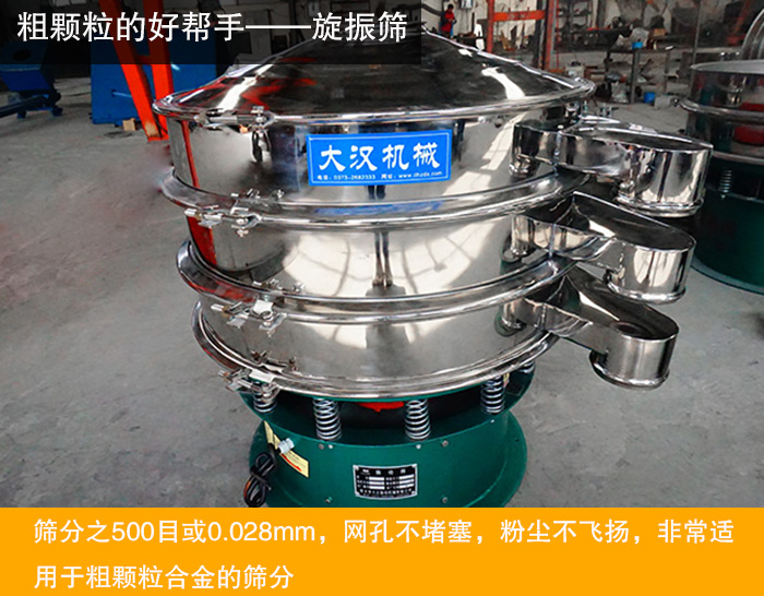旋振篩采用直立式振動電機做為激振源,電機上、下兩端安裝偏心重錘,將電機的旋轉運動轉變為水平、垂直、傾斜的三次元運動,再把這個歌運動傳遞給篩面。調節上下兩端的相位角,可以改變物料的運動軌跡。旋振篩篩分效率高,設計精巧耐用,的粉類、粘液均可篩分。并且換網容易,操作簡單,清洗方便??珊Y分之500目或0.028mm,網孔不堵塞,粉塵不飛揚,非常適用于粗顆粒合金的篩分。