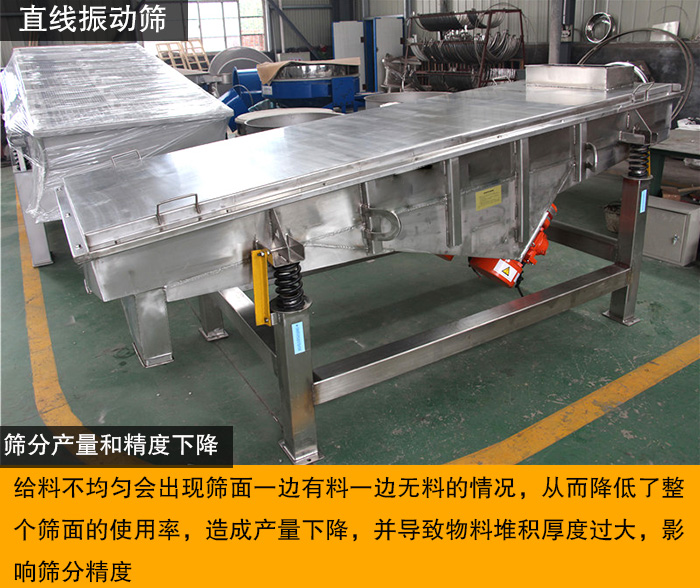進(jìn)料不均勻時(shí),就會(huì)出現(xiàn)篩面一邊有料一邊無料的情況,從而降低了整個(gè)篩面的使用率,造成產(chǎn)量達(dá)不到要求的問題。除此之外,由于進(jìn)料不均勻,一側(cè)物料堆積太厚。一旦物料堆積厚度過大,將影響篩分效果精細(xì)度。達(dá)不到預(yù)期篩分效果。